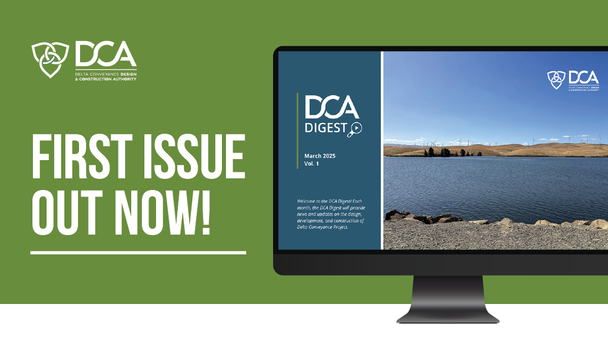 Each month, the DCA Digest will bring you the latest news and updates on the design, development, and construction of the Delta Conveyance Project. Our newly designed, visually engaging digest is available online through your web browser and can also be viewed as a PDF for easy access.