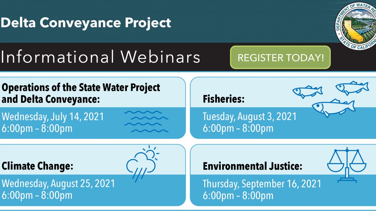 The schedule and topics for the Delta Conveyance Project Informational Webinars happening this summer have been announced. These virtual webinars will feature presentations from technical staff and provide background information related to preparation of the Draft Environmental Impact Report (EIR) and current progress, including approaches, methodologies and assumptions to be utilized in conducting impact analyses in the Draft EIR. Register today: https://water.ca.gov/…/Delta-Con…/DCP-Informational-Webinars