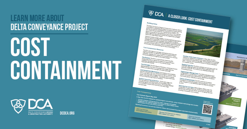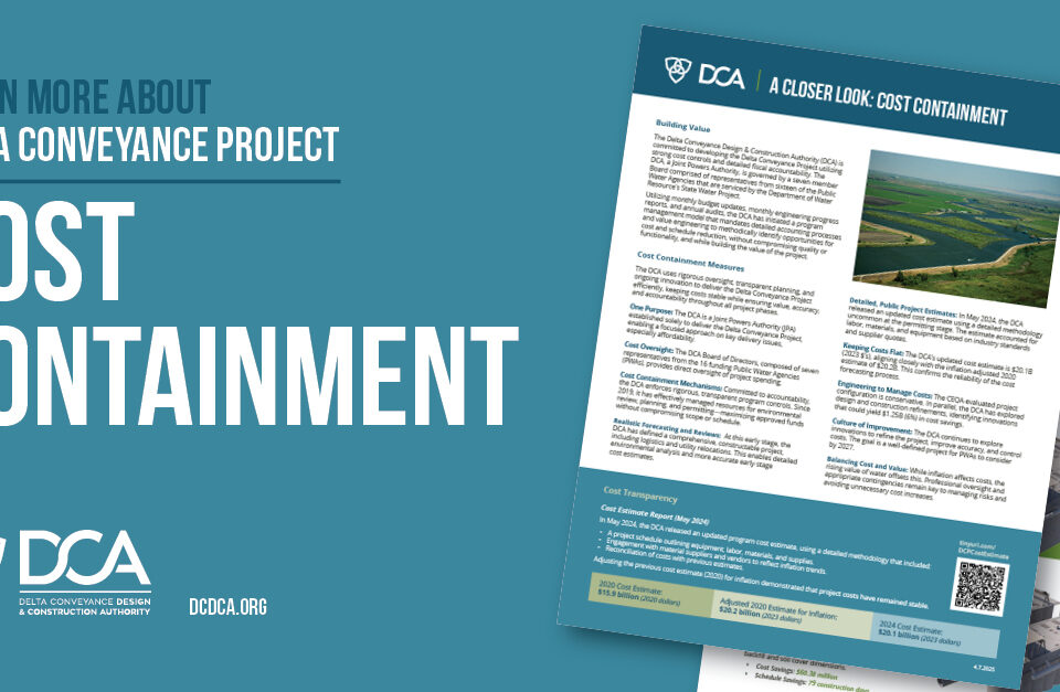 The DCA uses rigorous oversight, transparent planning, and ongoing innovation to deliver the Delta Conveyance Project efficiently. Watch our latest Cost Containment video to learn more.