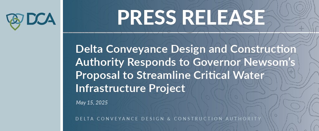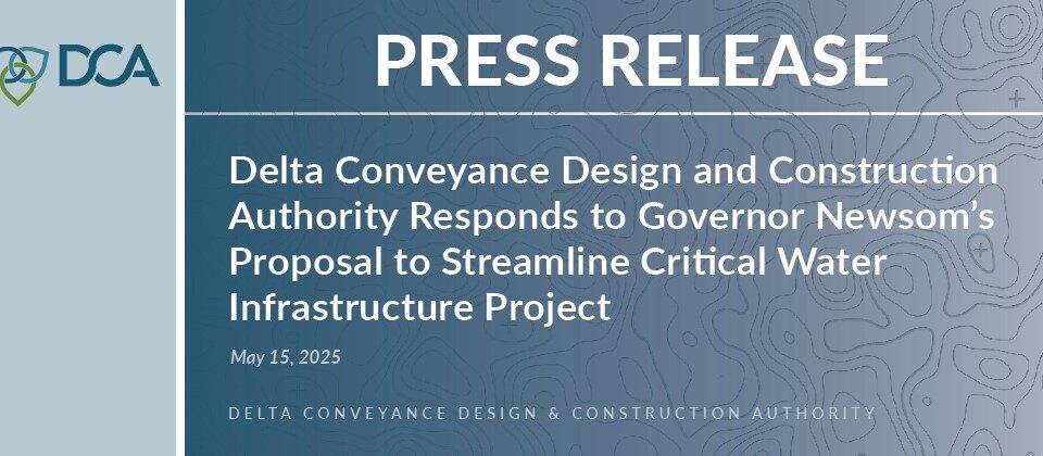 FOR IMMEDIATE RELEASE: May 16, 2025 CONTACT: valeriemartinez@dcdca.org SACRAMENTO, CA – At a Special Board Meeting held today, the Delta Conveyance Design and Construction Authority (DCA) […]